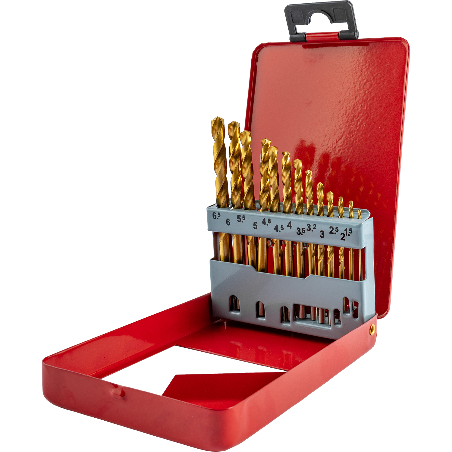 The drill bits are made from Titanium nitride coated HSS (hi-speed steel). The drill bits are fully precision ground at 135°