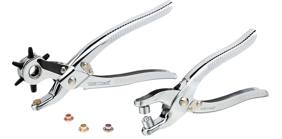 This Tork Craft leather punch plier allows you to punch holes in leather with ease. It has a rotating wheel with six different size. This allows you to punch different sizes holes in various different application or requirements also comes with a setting tool and a 100pc eyelets 5mm