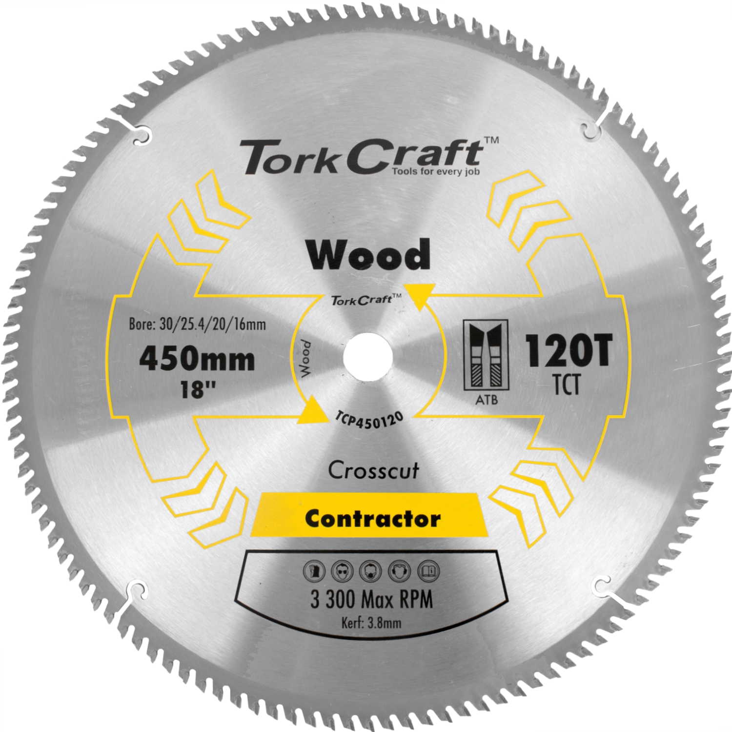 The Tork Craft TCP450120 is a 450 mm diameter circular saw blade with 120 TCT teeth, designed for contractor-grade use where finish, precision and throughput matter.