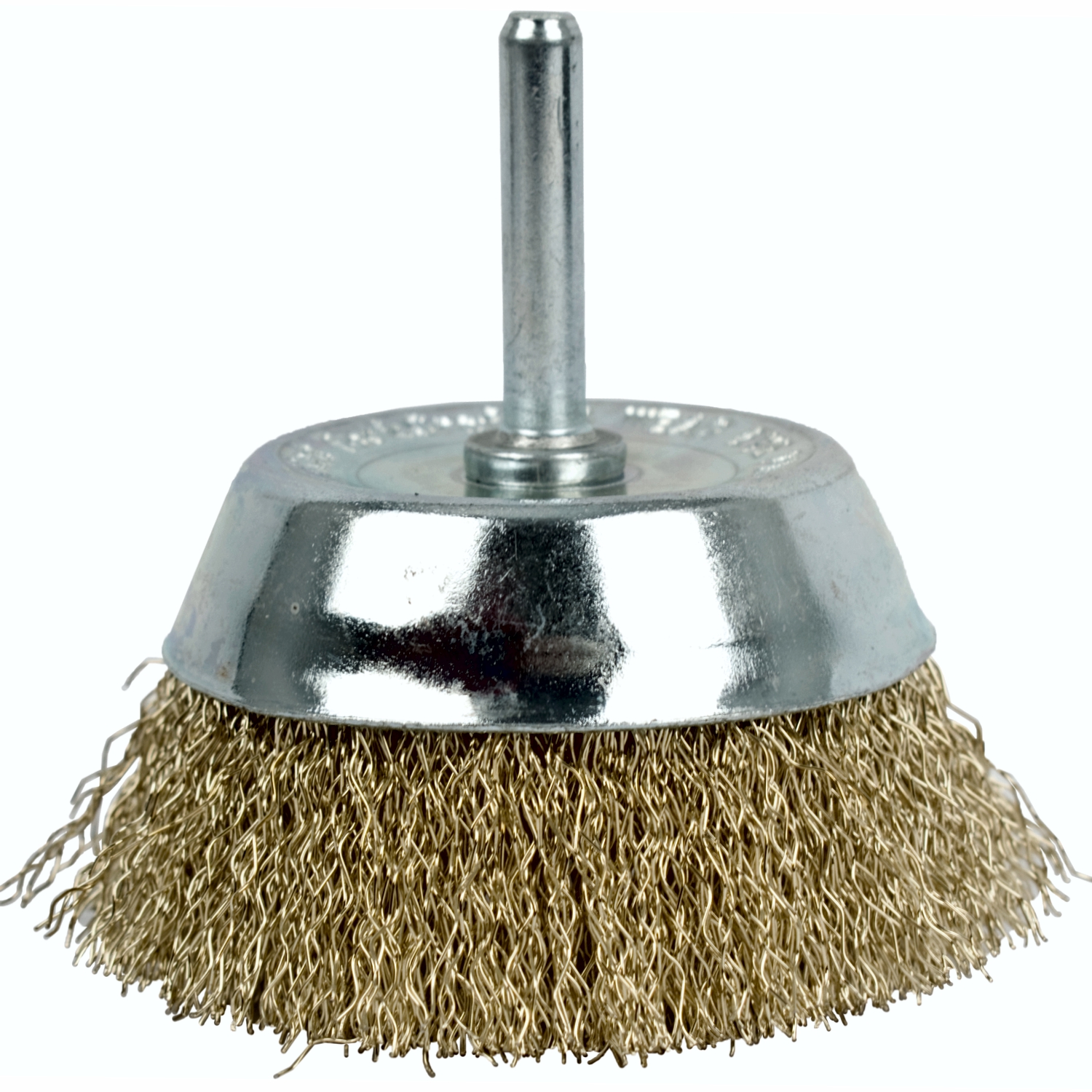 At a Glance: 75 mm wire cup brush with shaft mount for drill-driven rust, paint and corrosion removal on metal surfaces